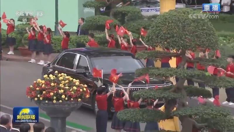习近平乘专机抵达河内内排国际机场时,越南国家主席梁强,越共中央政治局委员、中央书记处常务书记陈锦绣,越共中央书记处书记、中央办公厅主任黎怀忠等越南党政领导人和地方代表热情迎接。越南女青年向习近平献花。礼兵分列红地毯两侧,持枪致敬。当地青年身着民族服装,擂响鼓乐,载歌载舞,挥动两党两国旗帜,热烈欢迎习近平到访。