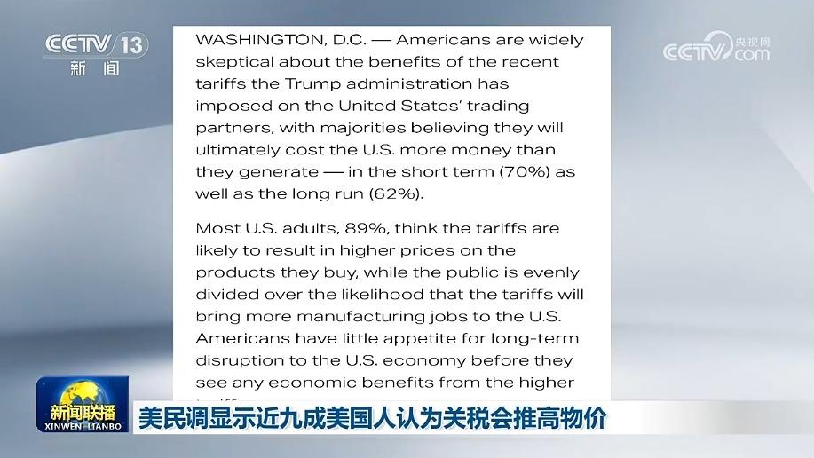 民意调查机构美国盖洛普28日公布最新民调结果称,89%的美国人认为美国关税政策可能会推高物价,增加生活成本。同一天,美国有线电视新闻网公布的另一项民调结果显示,59%的美国民众认为美国政府政策导致美国经济状况恶化。60%的美国人表示美政府政策已经导致生活成本增加。
