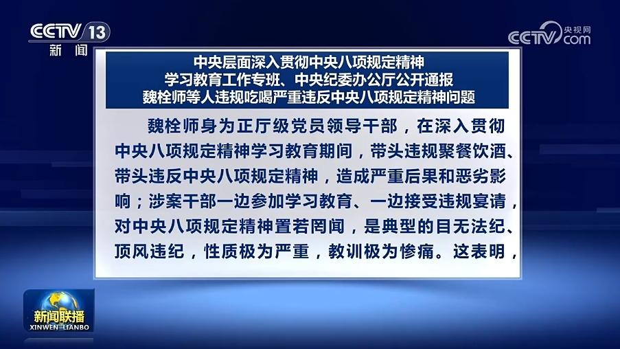 10. 中央层面深入贯彻中央八项规定精神学习教育工作专班 中央纪委办公厅公开通报魏栓师等人违规吃喝严重违反中央八项规定精神问题