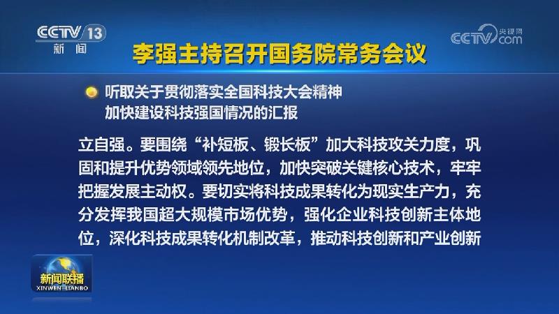 会议指出,全国科技大会召开一年来,各地区各部门深入贯彻落实习近平总书记重要讲话精神和党中央决策部署,有力有序推进科技改革发展各项任务落实,科技强国建设迈出坚实步伐。要进一步增强责任感紧迫感,锚定目标不松懈,以“十年磨一剑”的坚定决心,加快推进高水平科技自立自强。要围绕“补短板、锻长板”加大科技攻关力度,巩固和提升优势领域领先地位,加快突破关键核心技术,牢牢把握发展主动权。要切实将科技成果转化为现实生产力,充分发挥我国超大规模市场优势,强化企业科技创新主体地位,深化科技成果转化机制改革,推动科技创新和产业创新深度融合。