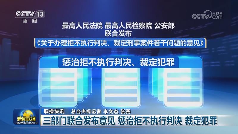 近日,最高人民法院、最高人民检察院、公安部联合发布意见,惩治拒不执行判决、裁定犯罪。《关于办理拒不执行判决、裁定刑事案件若干问题的意见》将于7月1日起施行,明确了积极构建公检法机关互相配合、互相制约的工作机制,切实维护当事人合法权益。