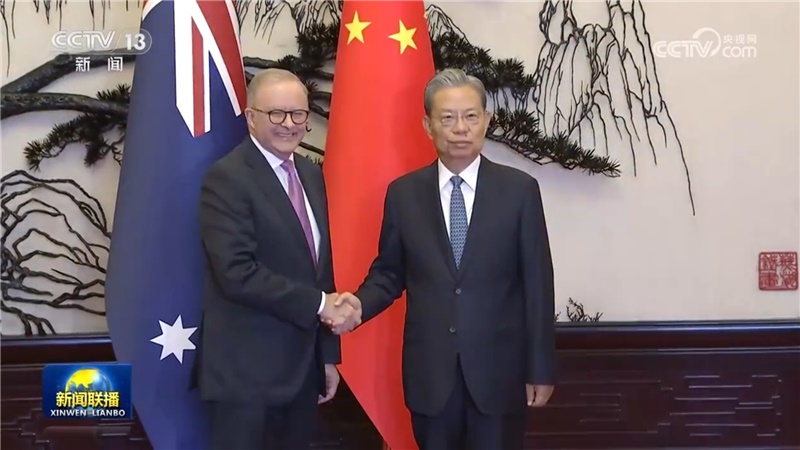 赵乐际表示,今天上午,习近平主席同总理先生举行了富有成果的会见,擘画了中澳关系发展的新蓝图。中方愿同澳方一道,落实两国领导人重要共识,高质量推进互利合作,持续深化民心相通,推动中澳关系长期健康稳定发展。中国全国人大愿同澳大利亚联邦议会加强友好交往,就立法、监督等开展经验交流,为双方务实合作提供法律保障。