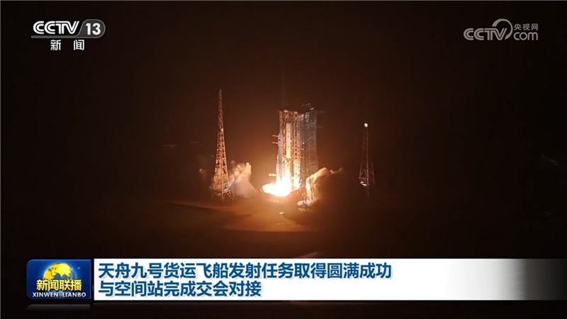 5时34分,长征七号遥十运载火箭准时点火起飞,约10分钟后,天舟九号货运飞船与火箭成功分离并进入预定轨道,之后飞船太阳能帆板顺利展开,神舟二十号航天员乘组也在空间站观看了天舟九号发射实况。