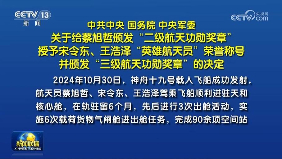 神舟十九号载人飞行任务的圆满成功,凝聚着广大科技工作者、航天员、干部职工、解放军指战员的智慧和心血。蔡旭哲、宋令东、王浩泽同志是其中的杰出代表,他们矢志报国、忠诚使命,不畏艰险、敢于担当,向世界展示了强大的中国志气、中国骨气和中国底气。蔡旭哲同志2次执行载人飞行任务、累计完成5次出舱活动,成为我国出舱次数最多的航天员。宋令东同志沉着冷静、勇挑重担,首次飞天即3次出舱,成为我国首位进行出舱活动的90后航天员。王浩泽同志坚定执着、艰苦磨砺,光荣入选神舟十九号乘组,成为首位进驻空间站的女航天飞行工程师。为褒奖他们为我国载人航天事业建立的卓著功绩,中共中央、国务院、中央军委决定,给蔡旭哲同志颁发“二级航天功勋奖章”,授予宋令东、王浩泽同志“英雄航天员”荣誉称号并颁发“三级航天功勋奖章”。