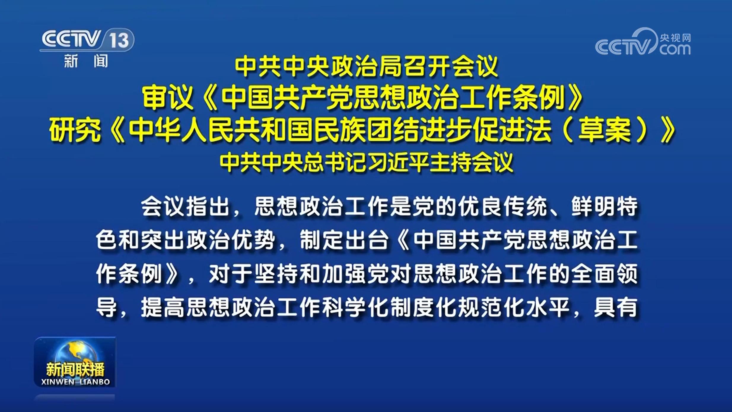 1. 中共中央政治局召开会议 审议《中国共产党思想政治工作条例》 研究《中华人民共和国民族团结进步促进法(草案)》 中共中央总书记习近平主持会议