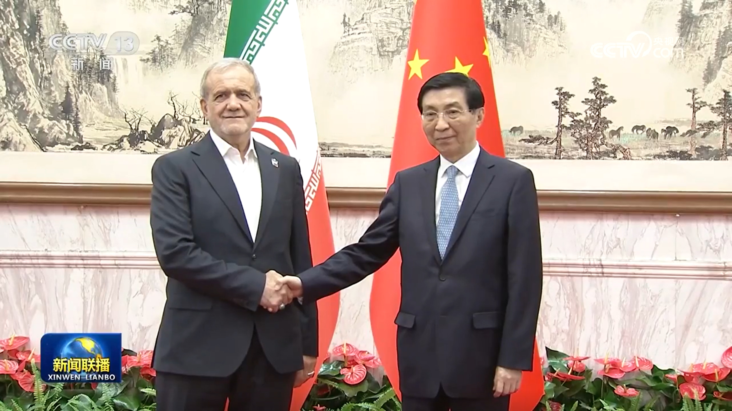 全国政协主席王沪宁2日在京会见来华出席2025年上海合作组织峰会和纪念中国人民抗日战争暨世界反法西斯战争胜利80周年活动的伊朗总统佩泽希齐扬。