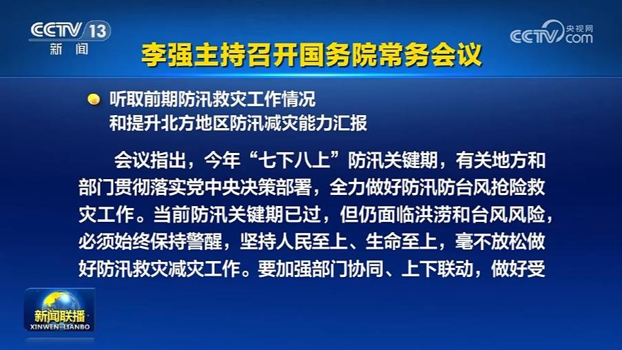 国务院总理李强9月12日主持召开国务院常务会议,听取前期防汛救灾工作情况和提升北方地区防汛减灾能力汇报,部署进一步促进民间投资发展的若干措施,研究完善海外综合服务体系,审议通过《生物医学新技术临床研究和临床转化应用管理条例(草案)》。