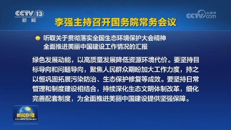 国务院总理李强9月19日主持召开国务院常务会议,听取关于贯彻落实全国生态环境保护大会精神全面推进美丽中国建设工作情况的汇报,研究关于在政府采购中实施本国产品标准及相关政策,讨论《中华人民共和国银行业监督管理法(修订草案)》。
