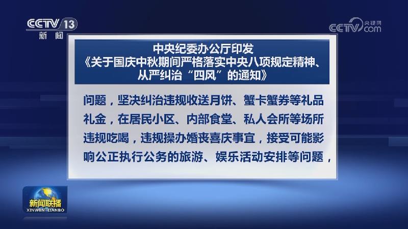 国庆、中秋将至,为巩固拓展深入贯彻中央八项规定精神学习教育成果,中央纪委办公厅日前印发《关于国庆中秋期间严格落实中央八项规定精神、从严纠治“四风”的通知》(以下简称《通知》)。