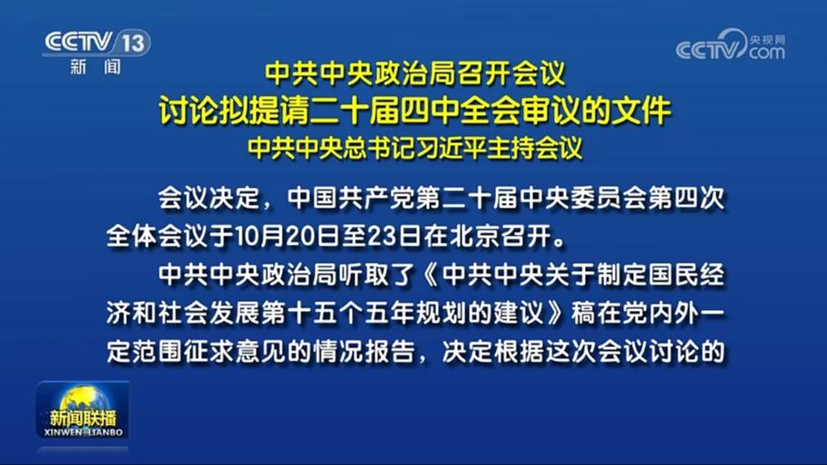 会议决定,中国共产党第二十届中央委员会第四次全体会议于10月20日至23日在北京召开。