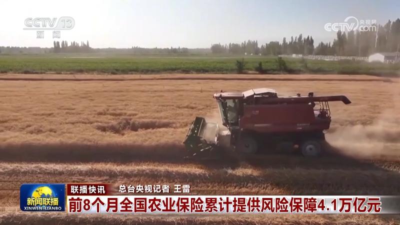 前8个月全国农业保险累计提供风险保障4.1万亿元