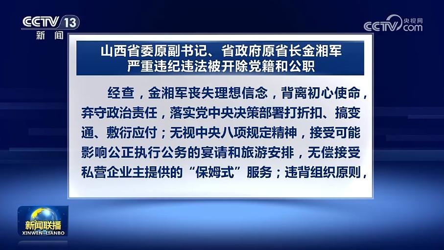 经中共中央批准,中央纪委国家监委对第二十届中央委员,山西省委原副书记、省政府原省长金湘军严重违纪违法问题进行了立案审查调查。