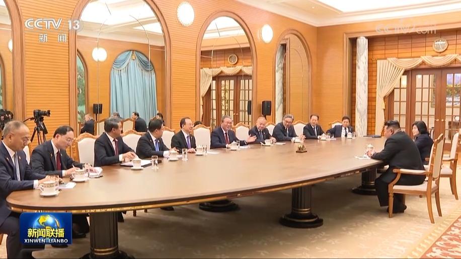 习近平强调,中朝两国同为共产党领导的社会主义国家。近年来,我同总书记同志多次会晤,为两党两国关系发展领航把舵,开启中朝友谊崭新篇章。前不久,总书记同志来华出席纪念中国人民抗日战争暨世界反法西斯战争胜利80周年活动,我同总书记同志深入会谈,为中朝双方进一步发展友好合作关系指明了前进方向。无论国际形势如何变化,维护好、巩固好、发展好中朝关系,始终是中国党和政府不变的方针。中方愿同朝方一道,加强战略沟通,深化务实合作,密切协调配合,推动中朝关系不断向前发展,服务两国社会主义建设事业,为地区乃至世界和平稳定和发展繁荣作出积极贡献。祝愿朝鲜劳动党不断取得更大成就!祝愿中朝友谊万古长青!
