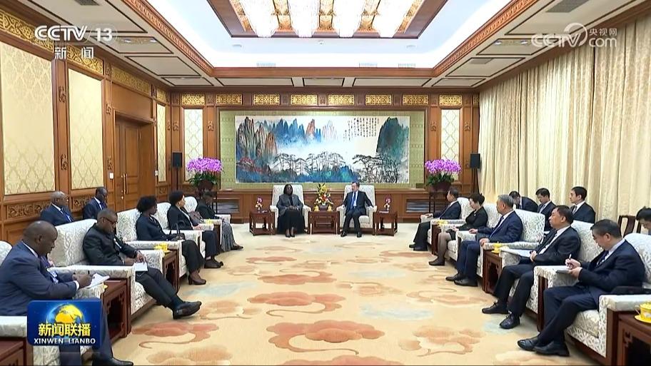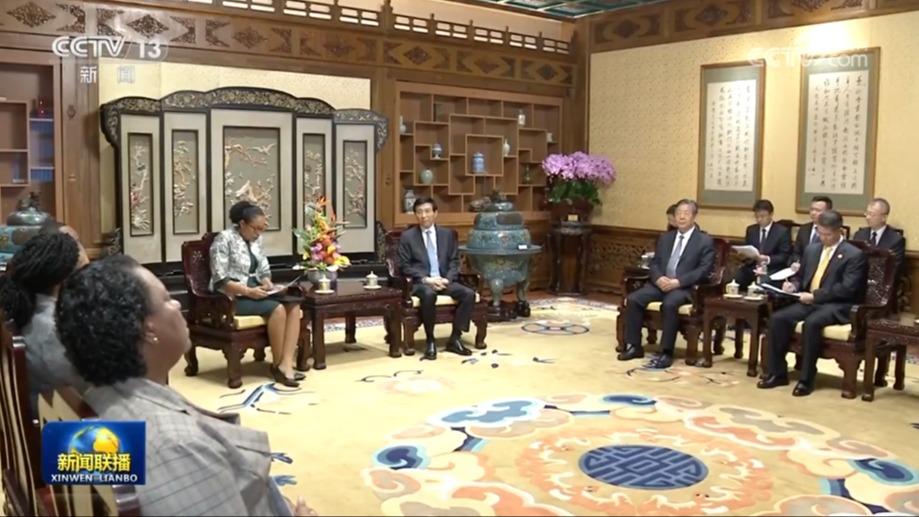 全国政协主席王沪宁14日在京会见来华出席全球妇女峰会的多米尼克总统伯顿。