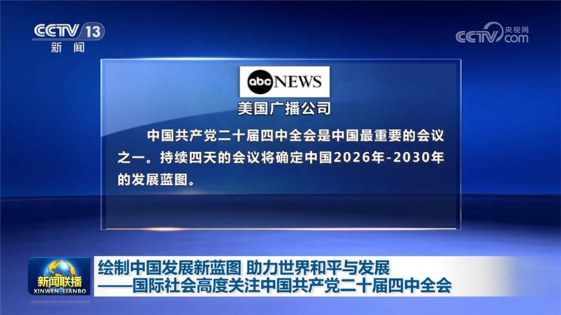 美国广播公司报道说,中国共产党二十届四中全会是中国最重要的会议之一,持续四天的会议将确定中国2026年—2030年的发展蓝图。