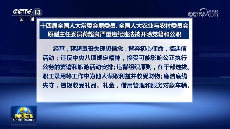 经中共中央批准,中央纪委国家监委对十四届全国人大常委会原委员、全国人大农业与农村委员会原副主任委员蒋超良严重违纪违法问题进行了立案审查调查。