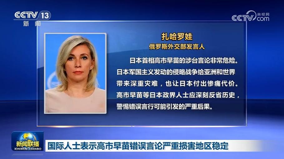 俄罗斯外交部发言人扎哈罗娃近日表示,日本首相高市早苗的涉台言论非常危险。日本军国主义发动的侵略战争给亚洲和世界带来深重灾难,也让日本付出惨痛代价。高市早苗等日本政界人士应深刻反省历史,警惕错误言行可能引发的严重后果。