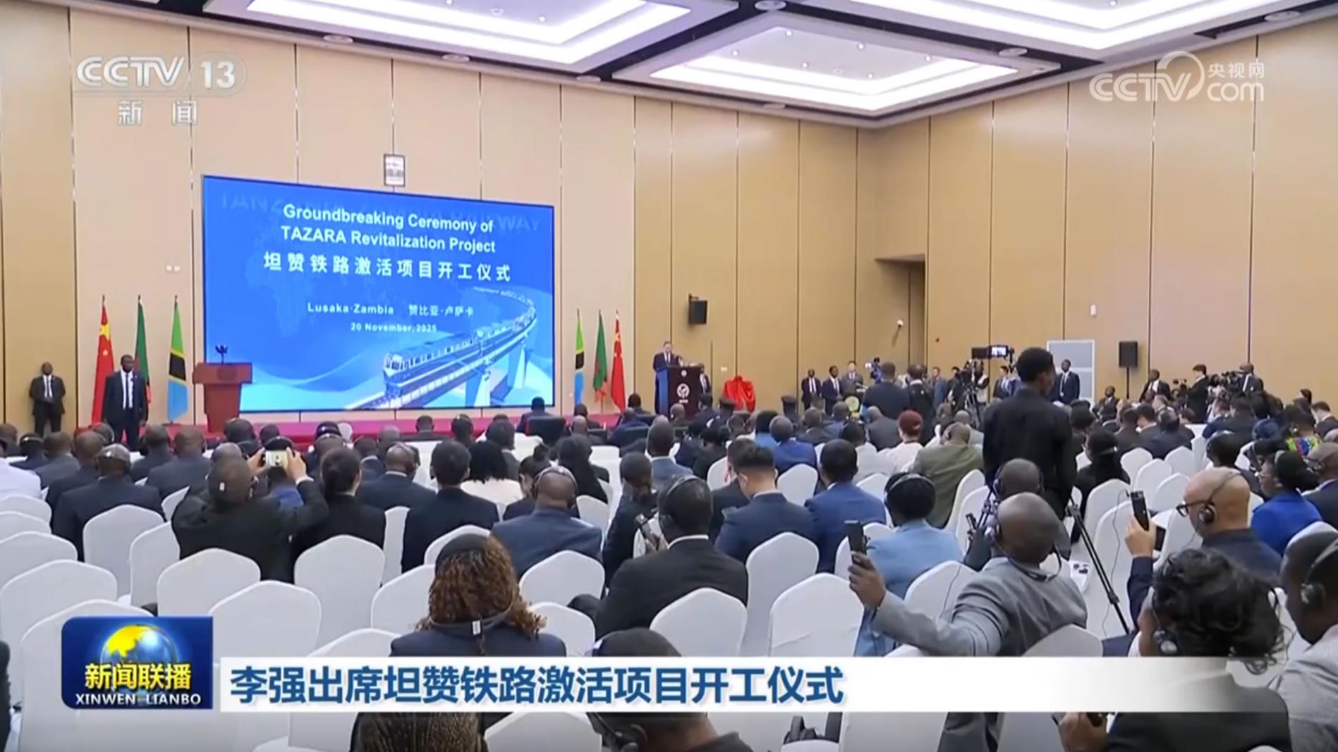 当地时间11月20日,国务院总理李强在卢萨卡同赞比亚总统希奇莱马、坦桑尼亚副总统恩钦比共同出席坦赞铁路激活项目开工仪式。