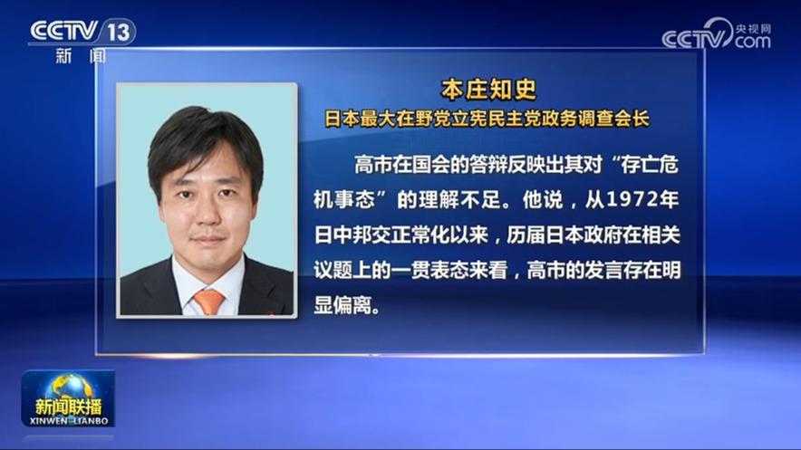 日本最大在野党立宪民主党政务调查会长本庄知史表示,高市在国会的答辩反映出其对“存亡危机事态”的理解不足。他说,从1972年日中邦交正常化以来,历届日本政府在相关议题上的一贯表态来看,高市的发言存在明显偏离。