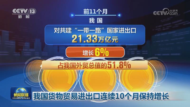 前11个月,我国对共建“一带一路”国家进出口21.33万亿元,增长6%,占我国外贸总值的51.8%。对东盟进出口6.82万亿元,增长8.5%,东盟继续保持我国第一大贸易伙伴。对欧盟进出口5.37万亿元,增长5.4%,欧盟为我国第二大贸易伙伴。
