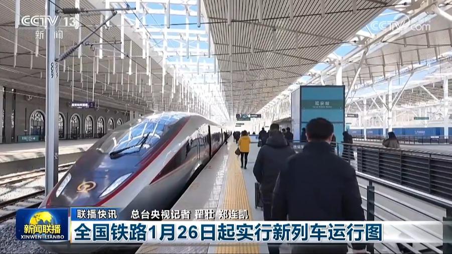 记者从国铁集团获悉,1月26日零时起,全国铁路将实行新列车运行图,2025年底开通的西延高铁等多条新线接入全国铁路网。调图后,全国铁路将安排图定旅客列车12130列,较现图增加243列;开行货物列车23748列,较现图增加177列。