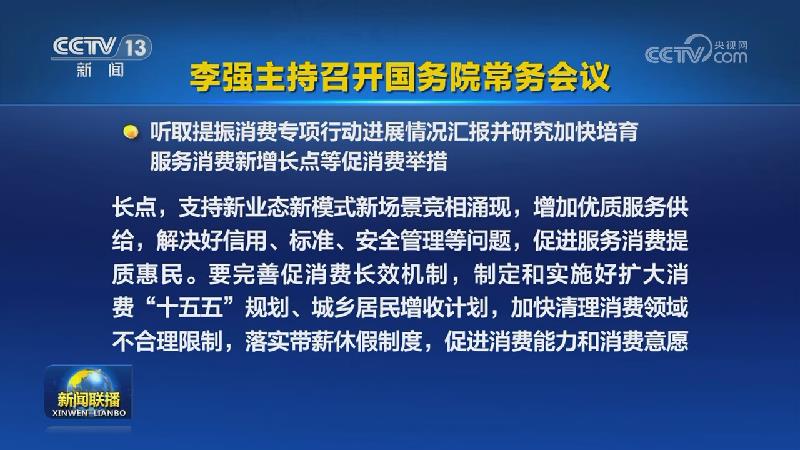 会议指出,去年开展提振消费专项行动以来,各地区各部门持续用力抓好政策落实,取得积极成效。要深入实施提振消费专项行动,充分释放各项政策集成效应,推动惠民生和促消费紧密结合,有效增强居民消费内生动力,充分发挥消费拉动经济增长的基础性作用。要加快培育服务消费新增长点,支持新业态新模式新场景竞相涌现,增加优质服务供给,解决好信用、标准、安全管理等问题,促进服务消费提质惠民。要完善促消费长效机制,制定和实施好扩大消费“十五五”规划、城乡居民增收计划,加快清理消费领域不合理限制,落实带薪休假制度,促进消费能力和消费意愿持续提升、消费结构和产业结构联动升级,加快建设强大国内市场。