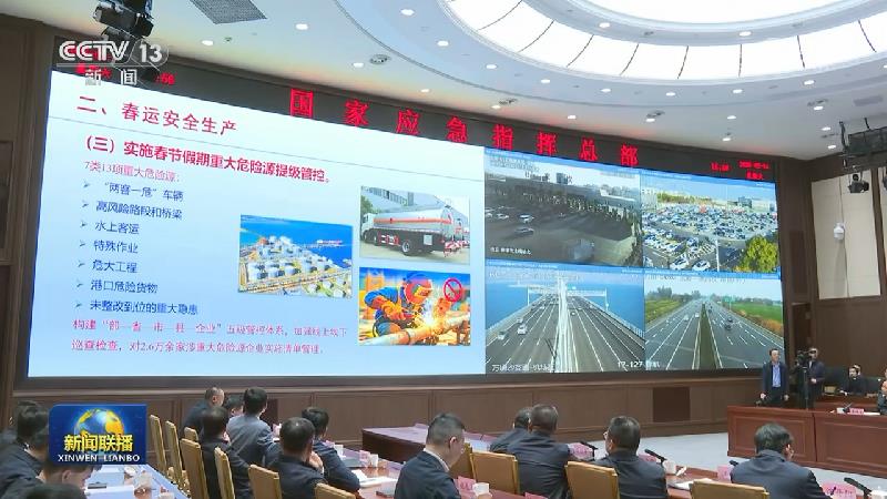 李强通过视频系统,调研了解春运春节期间综合交通运输安全生产和服务保障等情况。他指出,春运是检验交通运输服务能力的一次大考,今年假期比往年长,管理和服务压力更大。要统筹做好运力调配,加大重点地区、热点线路、高峰时段运力供给。要优化便民惠民措施,加强充电、加油、换乘等服务保障,用心用情帮助解决实际困难。要加强灾害天气防范应对,做好道路保通保畅工作,确保群众出行平安。随后,李强听取矿山、危化品、消防、重大工程施工等重点行业领域安全防范工作情况的汇报,了解春运春节安保工作。他强调,安全之弦务必时刻绷紧。要强化重点行业和领域安全监管,做好烟花爆竹和危化品风险防范,高度重视工矿企业安全管理,避免重特大安全生产事故发生。要加强人员密集场所隐患排查,加强安全管理和消防设施维护。要妥善纾解社会矛盾,及时做好重点群体心理疏导和社会救助,做到风险隐患早发现、早化解。