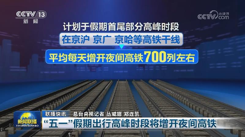 记者从国铁集团获悉,为满足“五一”假期旅客购票需求,计划于假期首尾部分高峰时段,在京沪、京广、京哈等高铁干线,平均每天增开夜间高铁700列左右,增开列车车票于开车前5天或7天开始发售。
