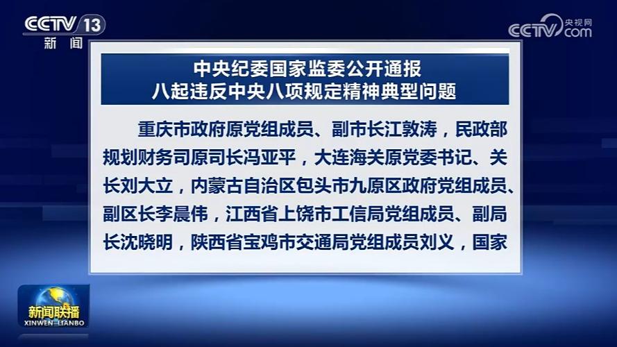重庆市政府原党组成员、副市长江敦涛,民政部规划财务司原司长冯亚平,大连海关原党委书记、关长刘大立,内蒙古自治区包头市九原区政府党组成员、副区长李晨伟,江西省上饶市工信局党组成员、副局长沈晓明,陕西省宝鸡市交通局党组成员刘义,国家电网湖北省黄冈市供电公司原党委委员、副总经理干磊,中国电信河北分公司市场部副总经理孙继峰,因违规吃喝、违规收受礼品礼金、接受可能影响公正执行公务的宴请和旅游活动安排等,或者政绩观偏差、盲目蛮干、乱作为等,受到严肃处理。